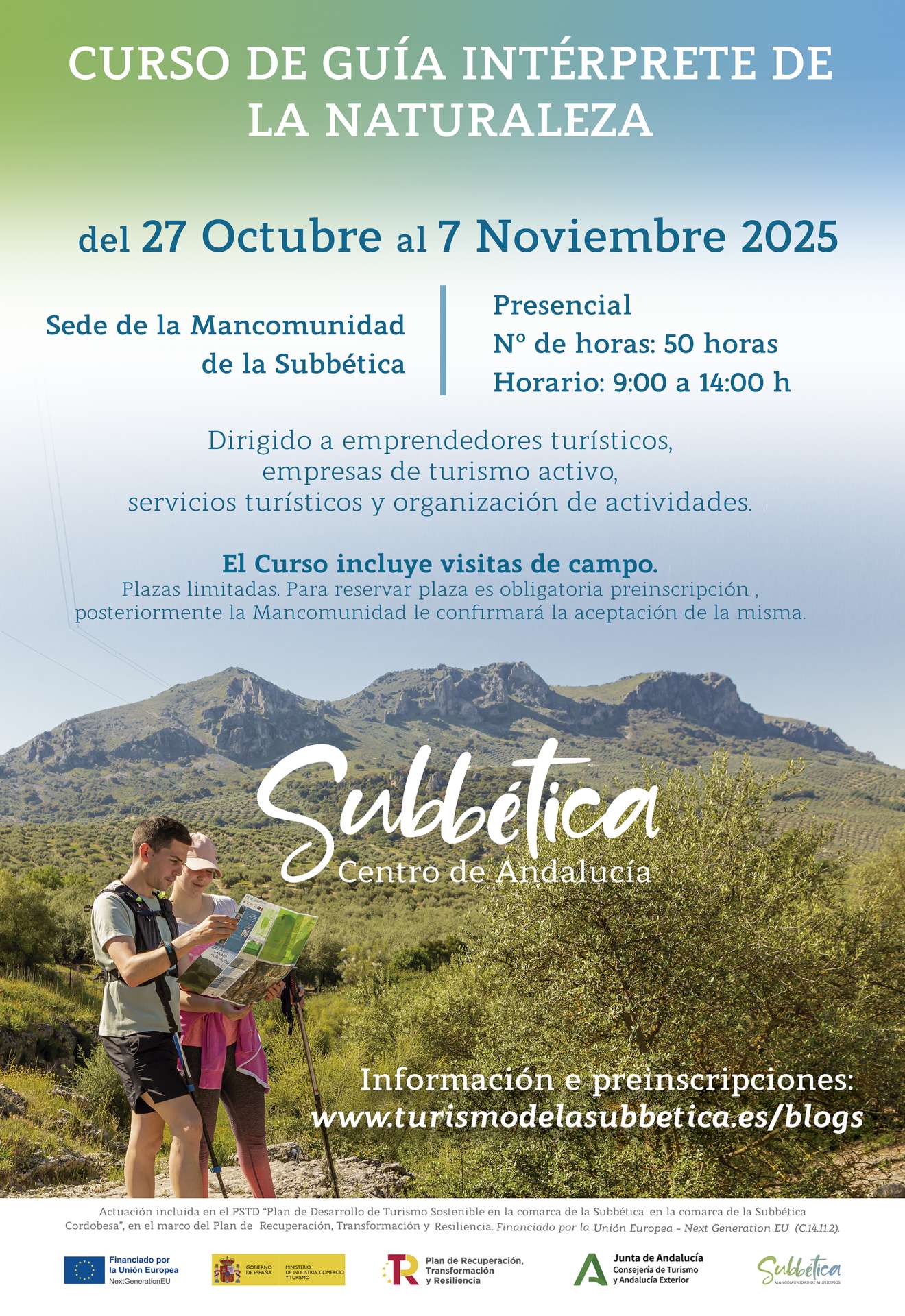 Este curso va dirigido a gestores de empresas de turismo activo, servicios turísticos y organización de actividades, y emprendedores turísticos. Se trata de una actuación incluida en el PSTD "Plan de Desarrollo de Turismo Sostenible en la comarca de la Subbética Cordobesa", en el marco del Plan de Recuperación, Transformación y Resiliencia - Financiado por la Unión Europea.  Next Generation EU (C.14.L1.2).