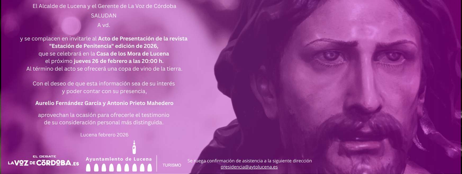 El Alcalde de Lucena y el Director de La Voz de Córdoba se complacen en invitarle a la Presentación de la Revista “Estación de Penitencia”, publicación especial dedicada a la Semana Santa, que tendrá lugar el próximo 26 de febrero, a las 20:00 horas, en la Casa de los Mora (C/ San Pedro, 52).