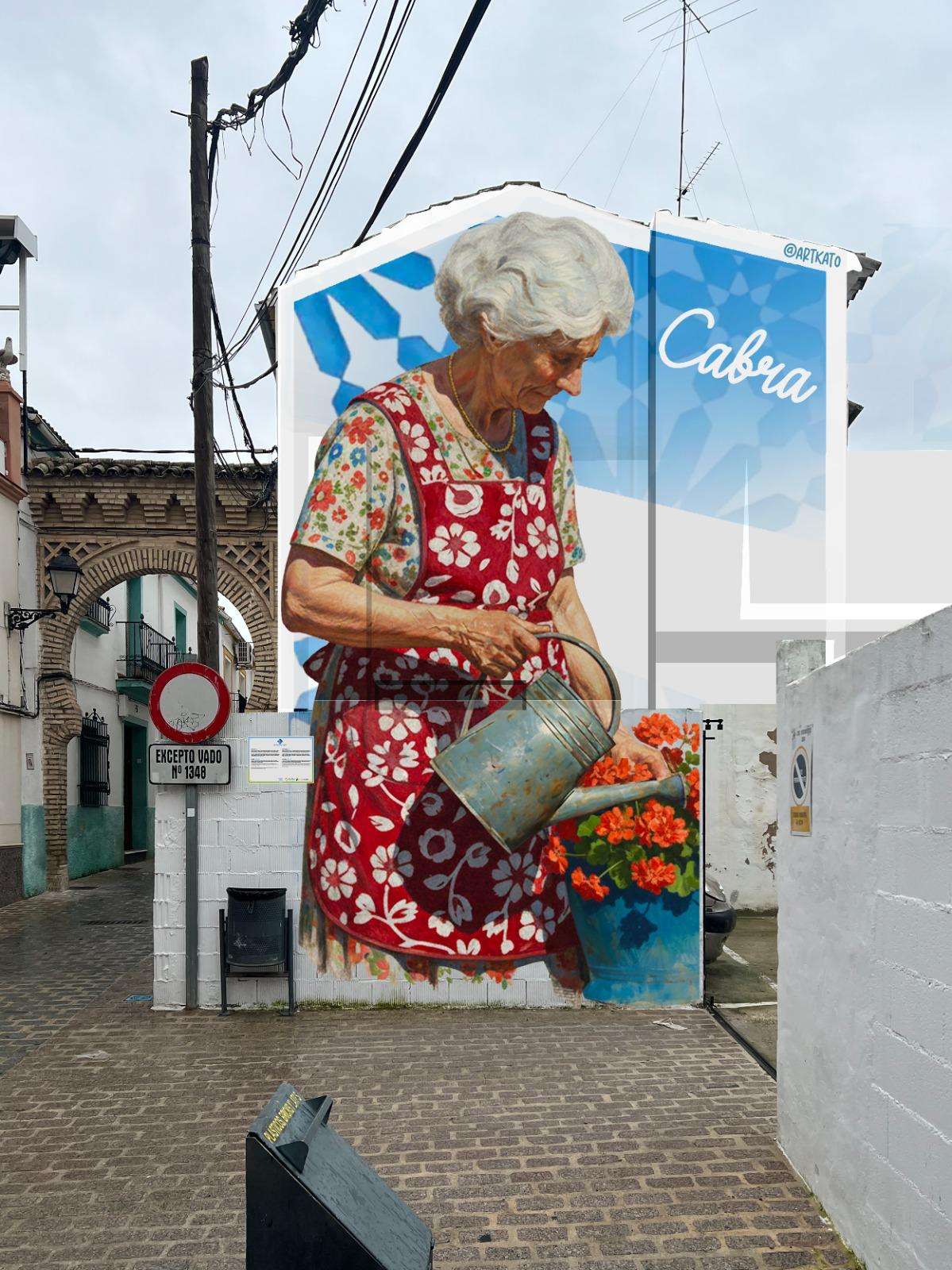 This mural is a small tribute to the women of the Cerro neighborhood—those ladies who, with hard work and affection, fill the streets with pots and flowers, turning every corner into an authentic garden. It is located next to the Puerta del Sol, an ancient arch with Moorish character that serves as the entrance to this special neighborhood in Cabra, renowned for its flower-filled streets.