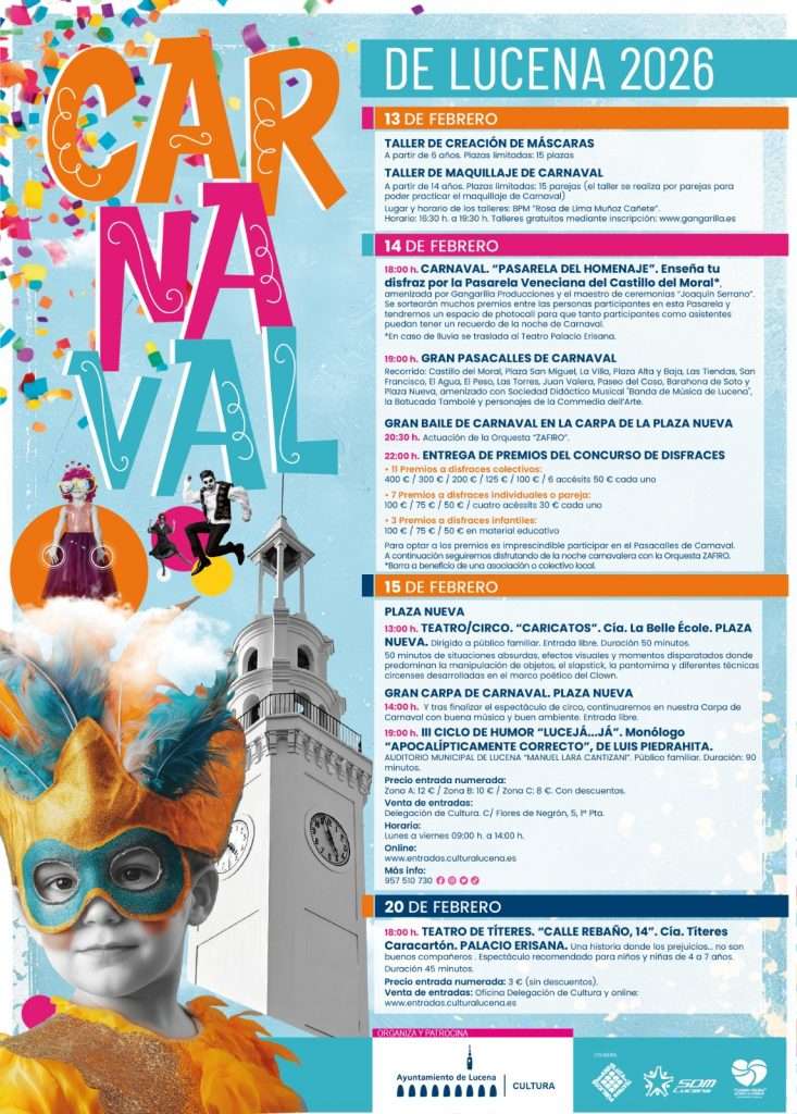 • 19:00 h | Gran Pasacalles de Carnaval: Recorrido por las calles principales con la «Banda de Música de Lucena», la Batucada Tambolé y personajes de la Commedia dell’Arte.