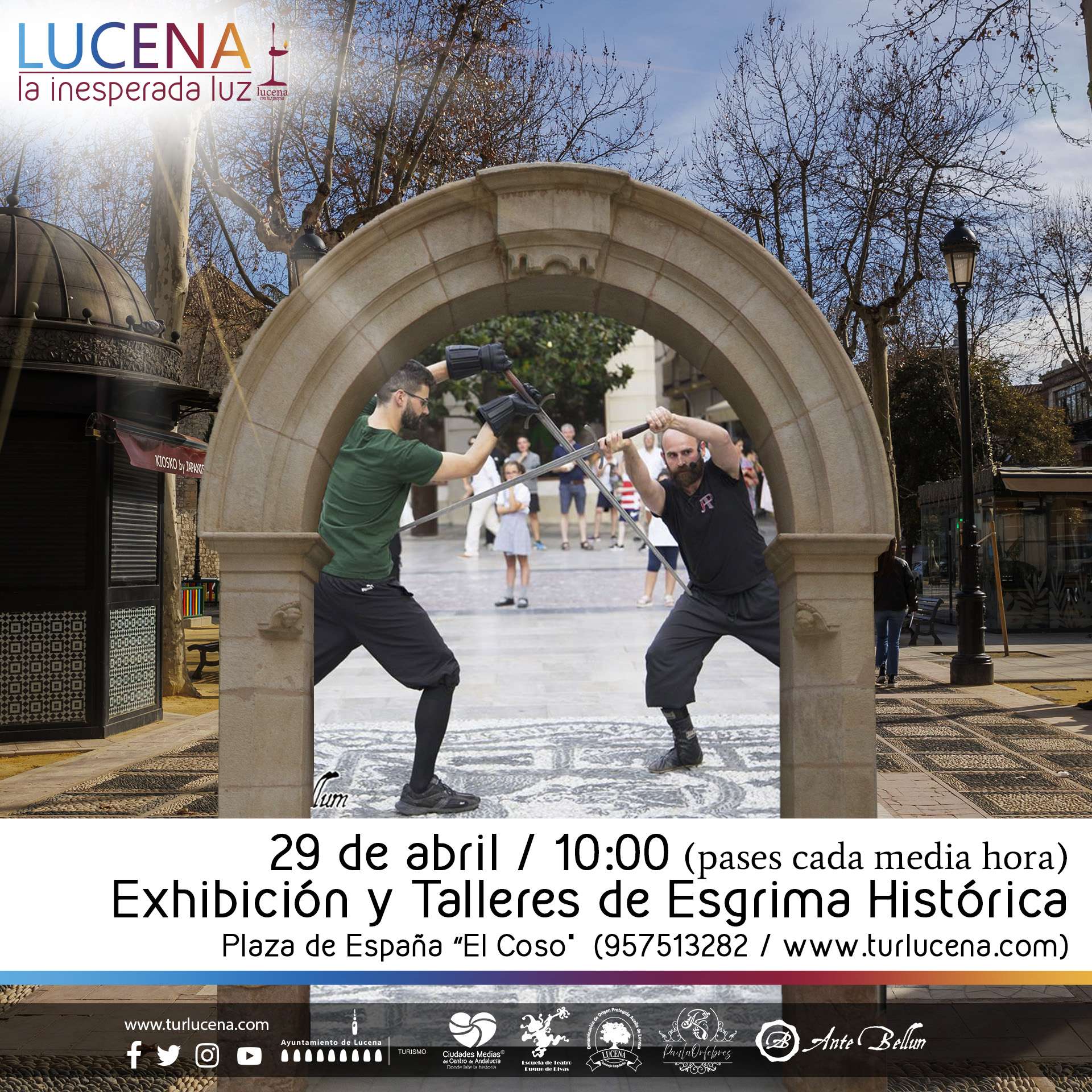Los especialistas en esgrima histórica de la Asociación Cultural ANTE BELLUM realizarán talleres de iniciación a la esgrima histórica a todos los lucentinos/as que así lo deseen, ya que es una actividad dirigida a TODOS LOS PÚBLICOS y además de diversas exhibiciones y demostraciones de esgrima histórica. Estos talleres se realizarían para diferentes franjas de edad y trabajando diversas disciplinas.