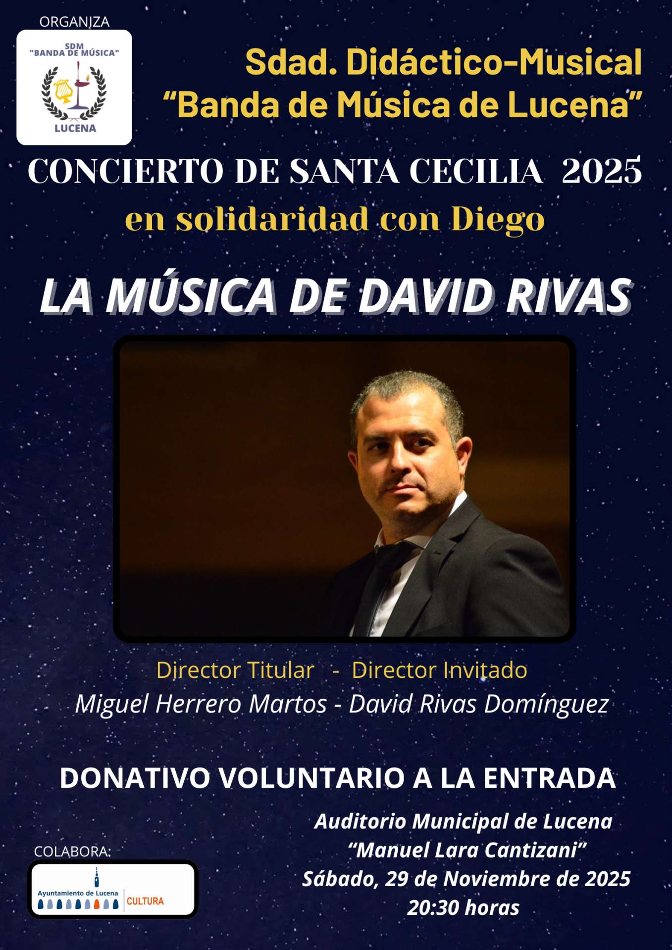 Concierto de Santa Cecilia 2025 “En solidaridad con Diego”, a cargo de la Banda de Música de Lucena, dirigida por Miguel Herrero Martos y con David Rivas Domínguez como director invitado.