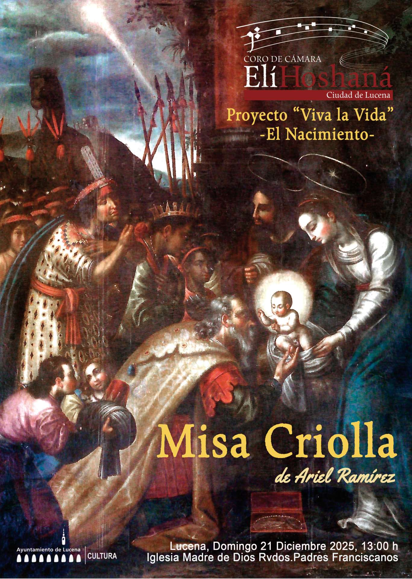 domingo 21 de Diciembre de 2025 la liturgia de las 13:00 h en la que el Coro de Cámara Elí Hoshaná "Ciudad de Lucena", interpretará la obra Navidad Nuestra, compuesta en 1964 por el músico y pianista