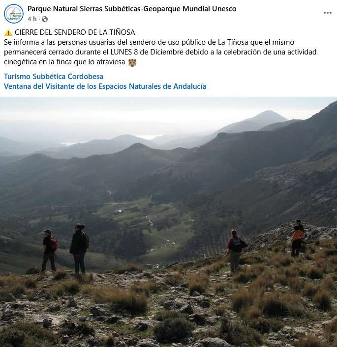 El Parque Natural Sierras Subbéticas ha informado a los usuarios y visitantes del sendero de La Tiñosa que este permanecerá cerrado durante el domingo 8 de diciembre debido a la realización de una actividad cinegética en la finca que atraviesa este emblemático itinerario.