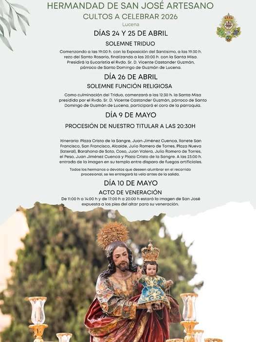 Itinerario: Plaza del Cristo de la Sangre, Calle juan Liménez Cuenca, Llanete San Francisco, San Frtancisco, Alcaide, Julio Romero de Torres, Plaza Nueva (lateral),donde San José en procesión, se reencontrará con la venerada imagen de María Santísima de Araceli, Barahona de Soto, Coso, Juan Valera, Julio Romero de Torres, El Peso, Juan Jiménez Cuenca y llanete del Cristo de la Sangre, teniendo prevista su entrada al templo a las 23:00 horas entre disparos de fuegos artificiales.